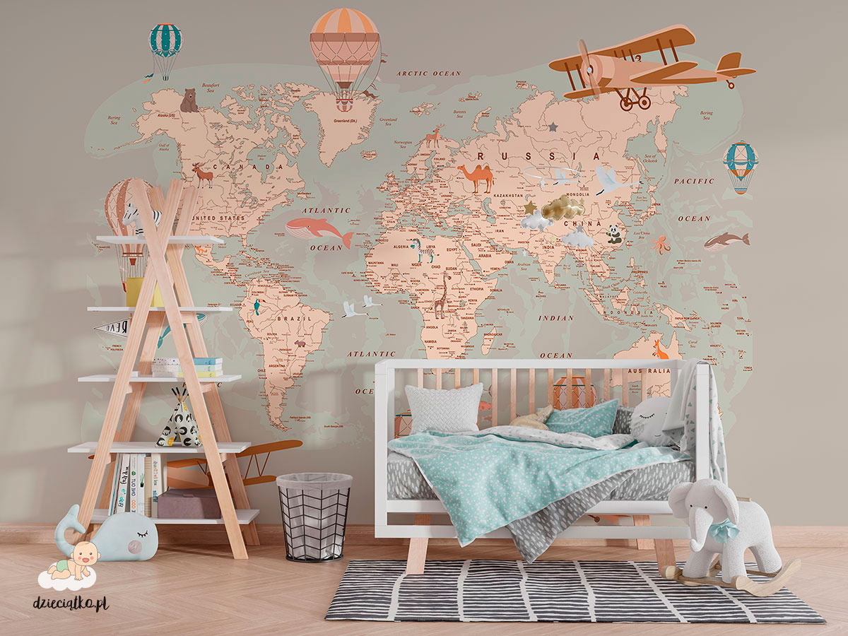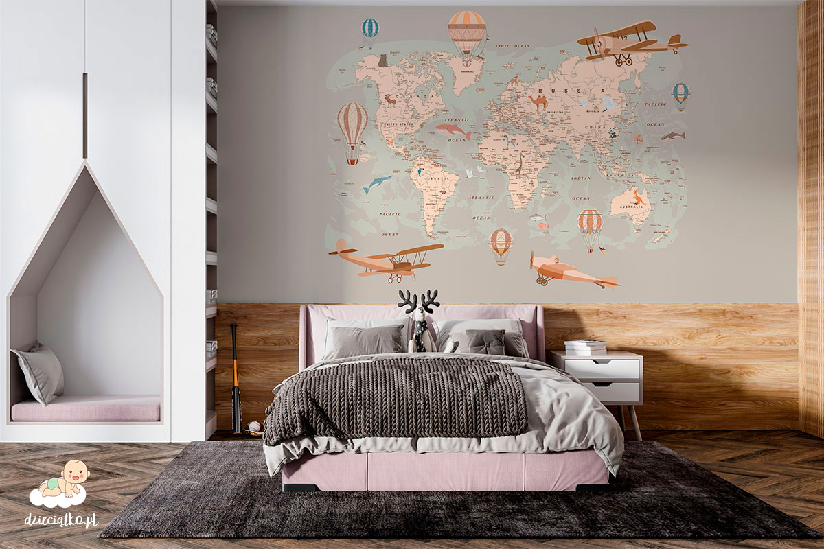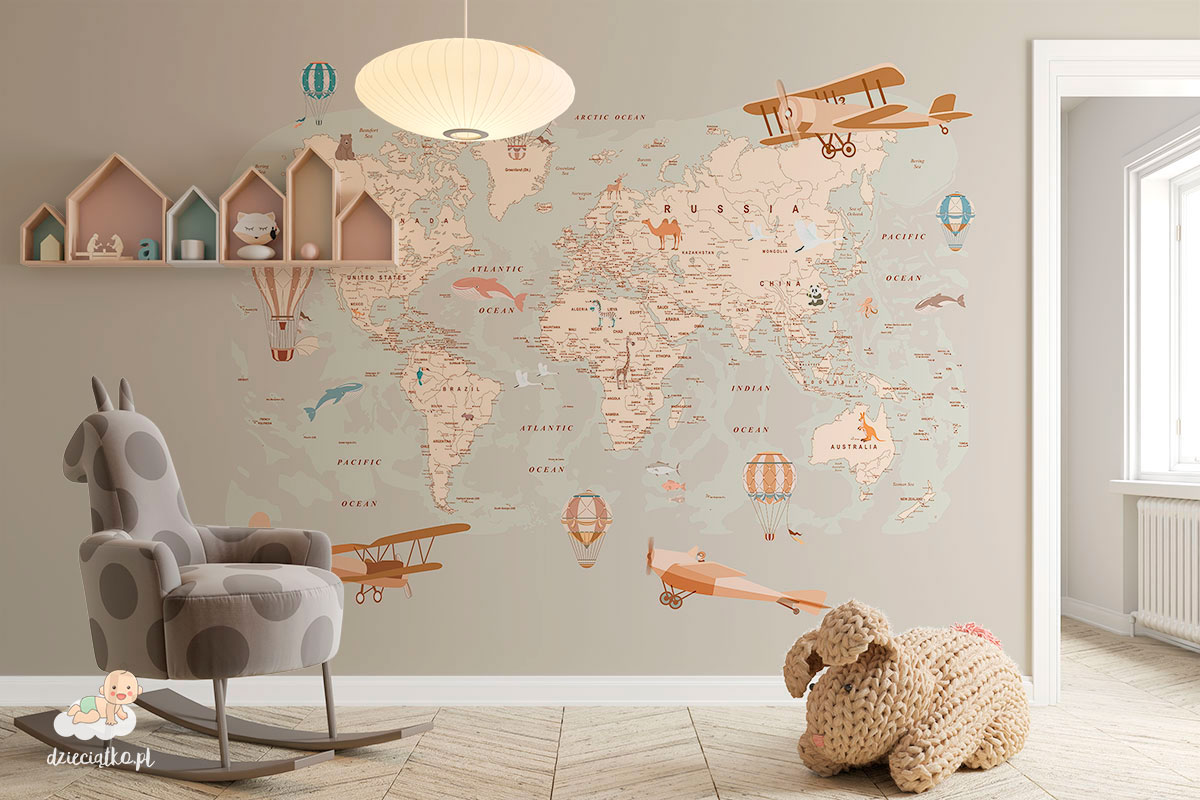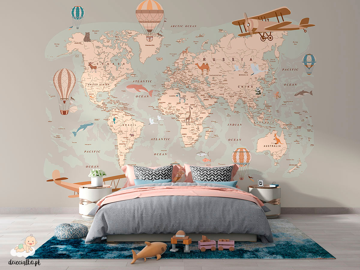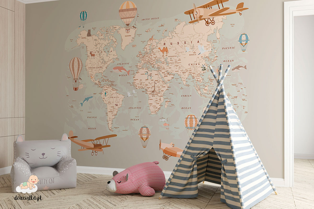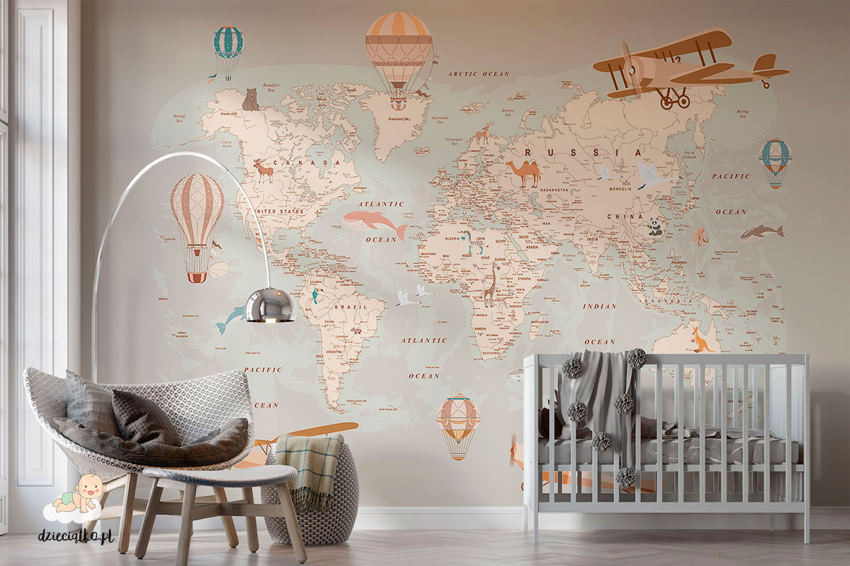 Wysokiej jakości fototapeta z unikatowym wzorem „Mapa z balonami”, który znakomicie sprawdzi się w pokoju dziecięcym.